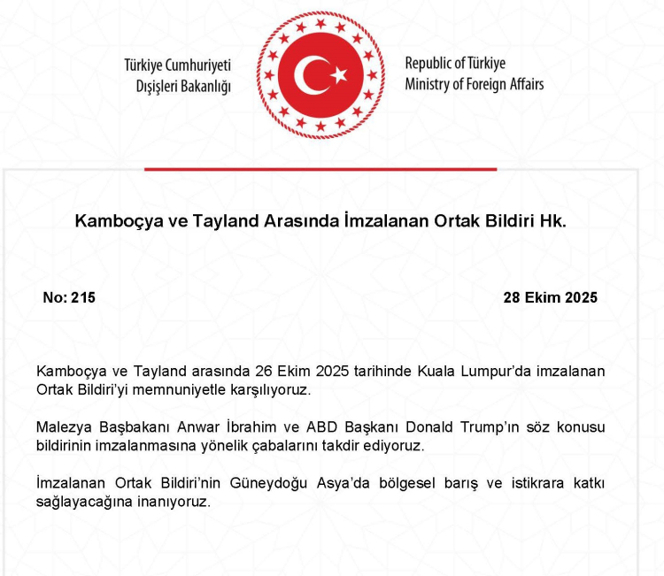 Dışişleri Bakanlığı, 26 Ekim 2025 tarihinde Kuala Lumpur’da imzalanan Kamboçya–Tayland Ortak Bildirisi’ni memnuniyetle karşıladığını açıkladı. Türkiye, bildirinin bölgesel barış ve istikrara katkı sağlayacağına inandığını belirtti.
